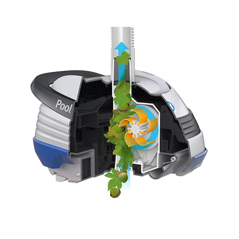 - Una tecnología patentada V-Flex, turbina de álabes móviles, que optimiza la limpieza de la piscina para capturar los residuos más grandes