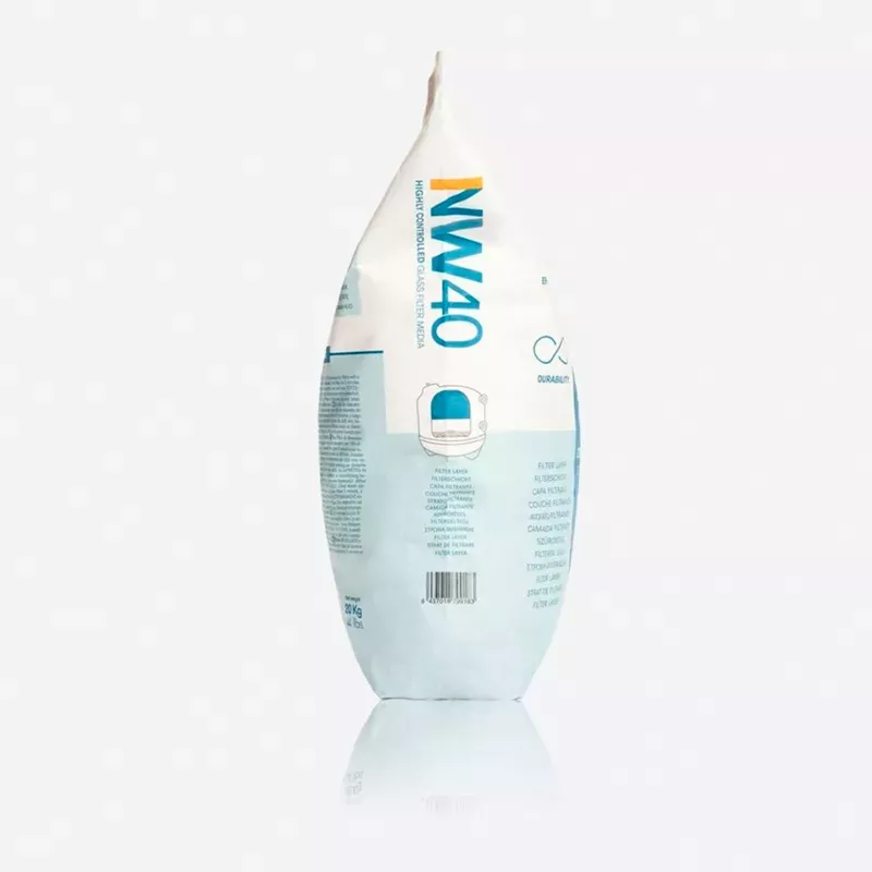 NW40 es un medio filtrante a base de vidrio reciclado que se ha desarrollado exclusivamente para la filtración de agua. Entre otras características, se ha higienizado mediante los más avanzados procesos de radiación Ultra-Violeta e inyección de Ozono y además se envasa en sacos de papel reciclable reforzado. NW40 se enfoca en retener la gran mayoría de las partículas que encontramos en una piscina, proporcionando un elevado nivel de filtración mientras permite un notable ahorro de agua y energía. Todo esto se logra gracias a la Tecnología de Alta Calibración, una selección precisa de los granos de vidrio que conforman la masa filtrante, y que solo requiere una capa para actuar.
