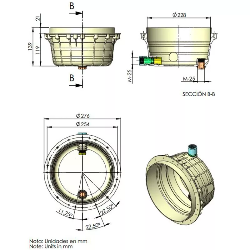 En PS con prensaestopas para proyectores 07838 y 07844. Salida cable opcional por lado nicho o por fondo nicho.