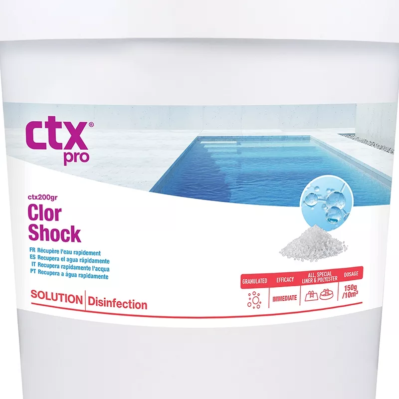 Añadir 15 gr. de producto por cada m3 de agua. Transcurridas 2 horas, ajustar el pH del agua entre 7,2 - 7,6 utilizando Minorador de pH sólido (CTX 10 ) ó Incrementador de pH sólido (CTX 20).