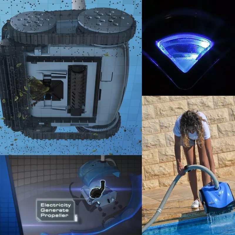 Es el primer limpiafondos hibrido del mercado. Convierte la corriente del agua en energía electrica.Cuenta con un sofisticado software que le permite detectar cuando ha llegado a una pared, modificando su recorrido para optimizar la limpieza del fondo de la piscina.