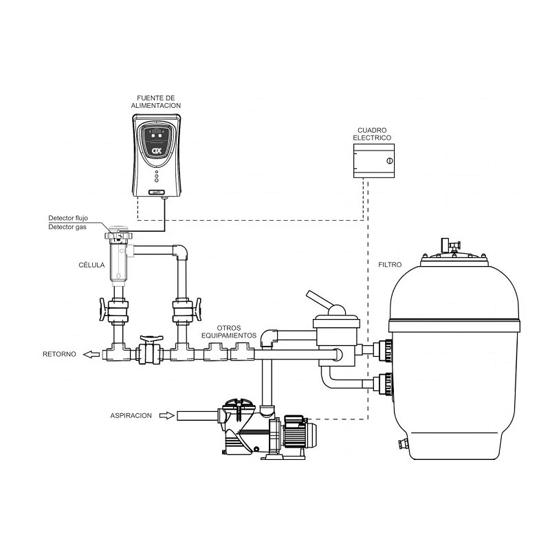 Desinfección mediante electrólisis de la sal con electrodos de titanio de recubrimiento autolimpiable por inversión de polaridad electrónica, microprocesador y detector de caudal incluido.