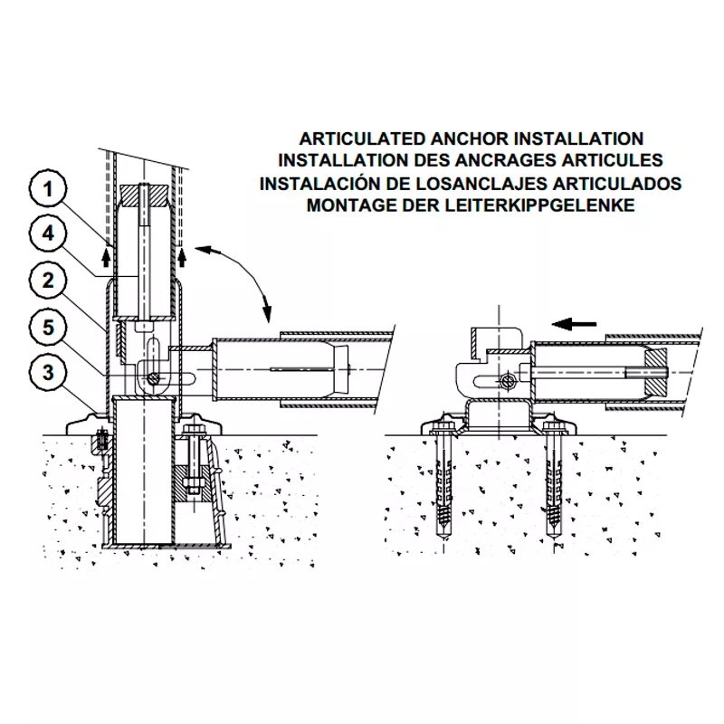 En el modelo con pletina procederemos a su fijación en el suelo mediante los tornillos fijación suministrados a tal efecto. Para el modelo con anclaje empotrado, deberemos introducir el anclaje articulado y proceder a su fijación.