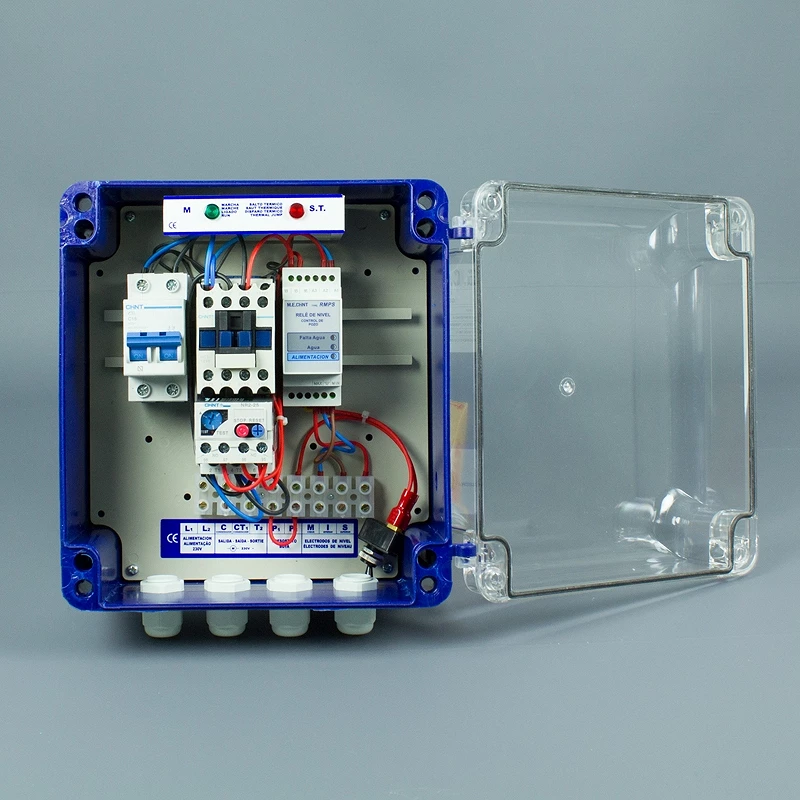 - Cuadro eléctrico para proteger térmicamente el motor contra sobreintensidades y cortocircuitos, con rele de sonda y electrodos para proteger la hidráulica de la bomba por falta de agua.