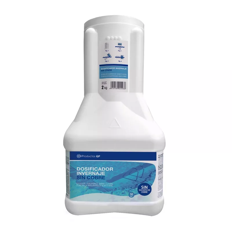 Dosificador con contenido de productos desinfectantes, alguicidas y floculantes para el mantenimiento de la piscina en la época invernal o de menor uso, evitando la descomposición del agua, y favoreciendo la limpieza y puesta a punto.