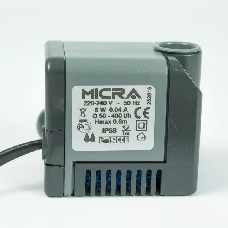 Micra es una bomba totalmente sumergible accionada por un motor sincrónico de imán permanente. Micra dispone de un filtro con esponja intercambiable y ofrece una regulación variable del caudal de 400 a 600 l/h, a través de una llave de 5 posiciones.