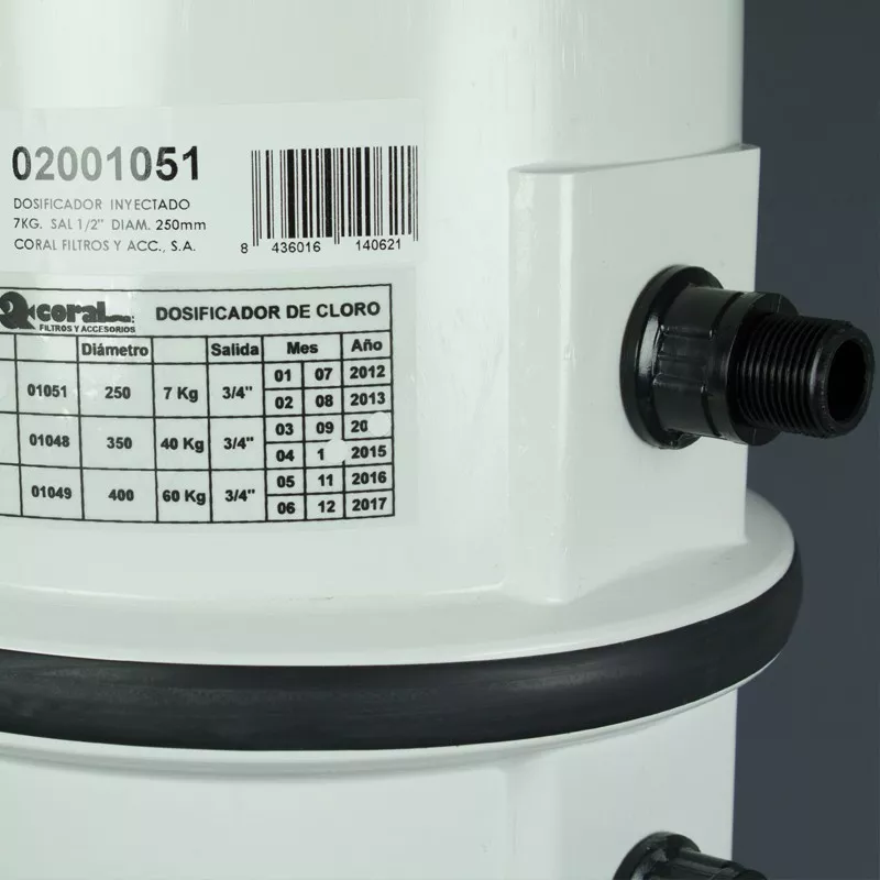 Langsam auflösendes Chlordosiergerät in Form von 100 und 200 g Tabletten für Schwimmbecken bis 150 m3.