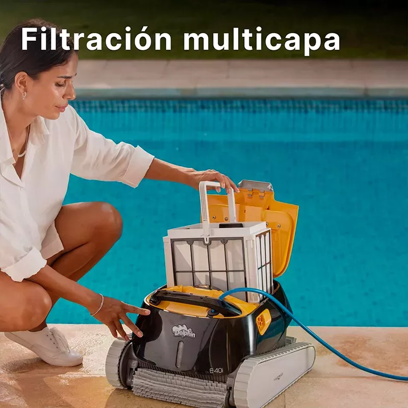 The Dolphin E40i uses a multi-layer filter, simultaneously separating and filtering coarse, fine and ultra-fine dirt, providing highly effective filtration without saturation.