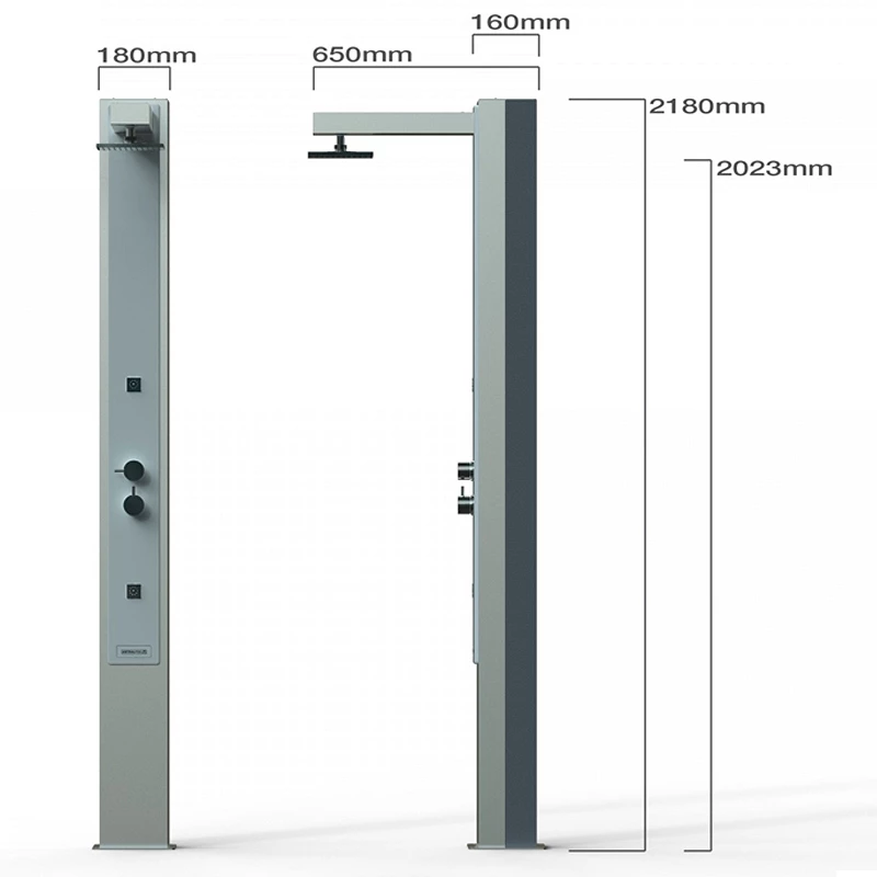 Solar shower in matt stainless steel AISI-316 with white acrylic front trim. Square zenithal shower head in anti-scale chromed brass, 2 front jets with nebuliser effect controlled by a 2-way reversing valve. With a cold water inlet it allows the water to be heated by means of a 25L aluminium accumulator tank using solar energy.