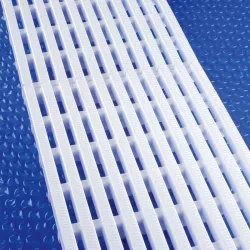 Range of overflow gratings for swimming pools. Homopolymer PP material, with additives for UV protection. Available in 500 mm long modules with quick and easy to assemble male and female anchorages.