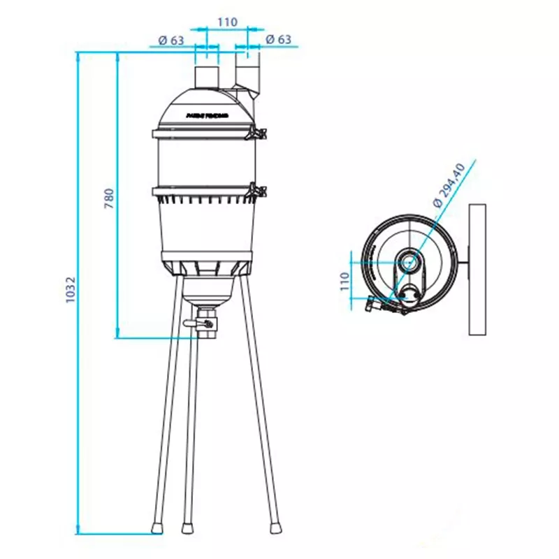 - Standard connections Ø63mm for water inlet and outlet and Ø32mm for dirt evacuation.