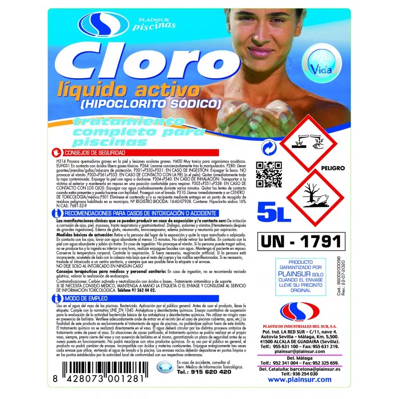 Principales caractéristiques du chlore liquide actif (hypochlorite) Plainsur 5 litres