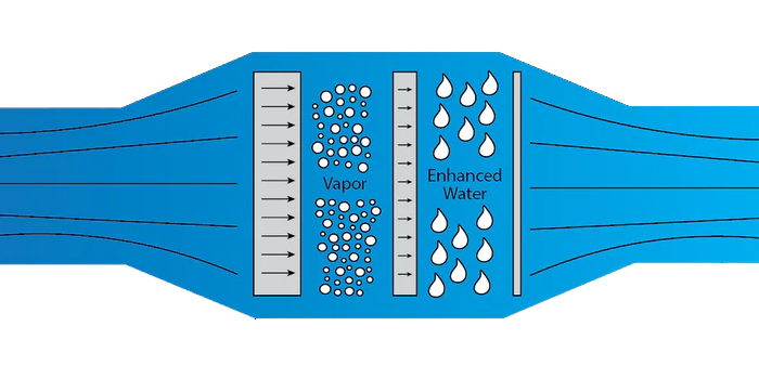 Dans notre appareil, la cavitation se produit lorsque l'eau est accélérée à l'intérieur de la buse de l'appareil. Cette accélération réduit la pression de l'eau en dessous du point de vapeur, ce qui entraîne la formation de petites bulles de vapeur. Lorsque les bulles de vapeur quittent la buse, la pression de l'eau environnante les fait s'effondrer rapidement et revenir à l'état liquide.
