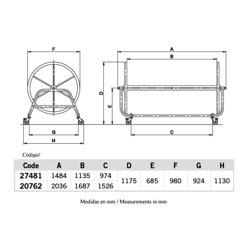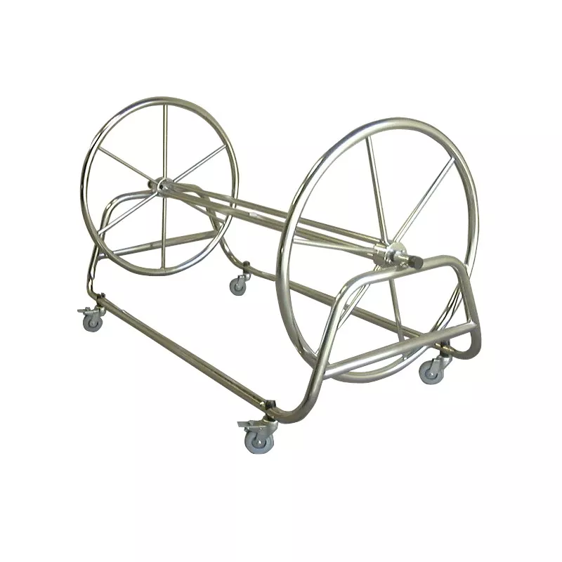 L'enrouleur mobile de 1,2 mètre est fabriqué en acier inoxydable AISI-304, équipé d'un volant de grand diamètre pour le fonctionnement et monté sur 4 roues pivotantes pour faciliter le transport.