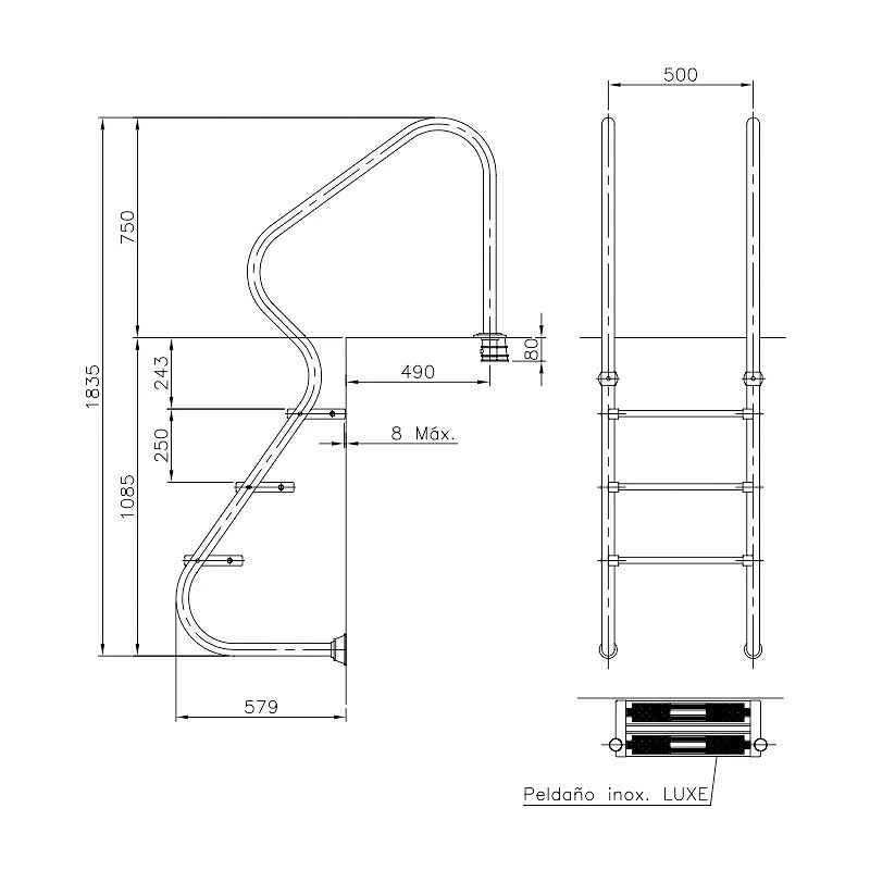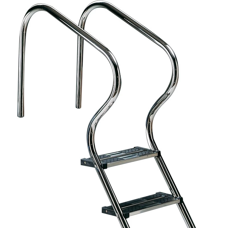 - Avec main courante Ø 43mm et marches Luxe en acier inoxydable. AISI-316 avec double surface antidérapante