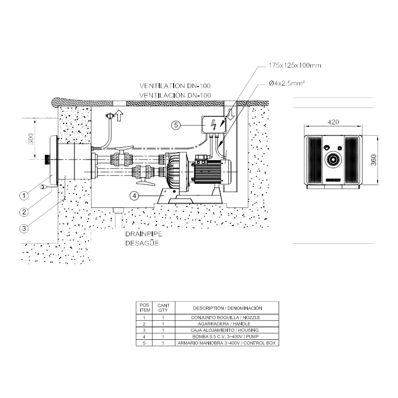 - Buse d'impulsion air-eau, débit réglable de 27 à 40 m3 /h, système d'aspiration