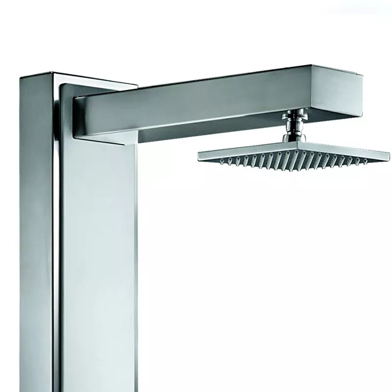 Doccia in acciaio inox AISI-316 opaco con rivestimento frontale bianco in "solid surface". Soffione zenitale quadrato in ottone cromato, 2 getti frontali con effetto nebulizzatore comandati da una valvola di inversione a 2 vie. Il flusso e la temperatura dell'acqua sono regolati da una valvola miscelatrice.