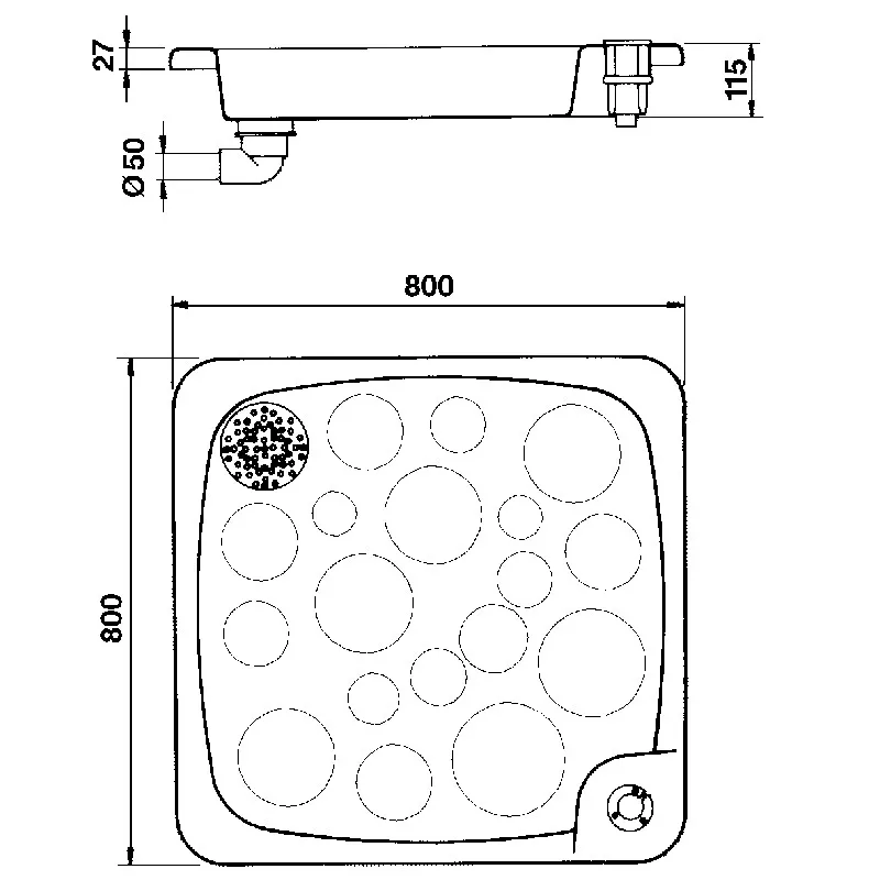 - Met afvoerputje met rooster Ø 130 mm, aansluiting Ø 50 mm.