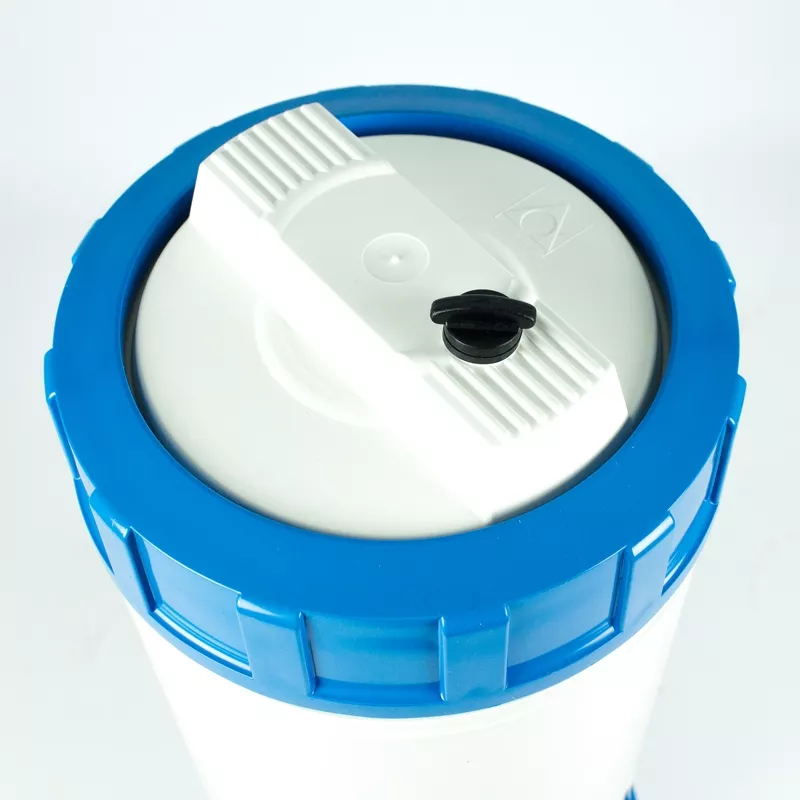 Vergemakkelijkt desinfectie met chloor en broom. Grote capaciteit en brede mond voor eenvoudig bijvullen.