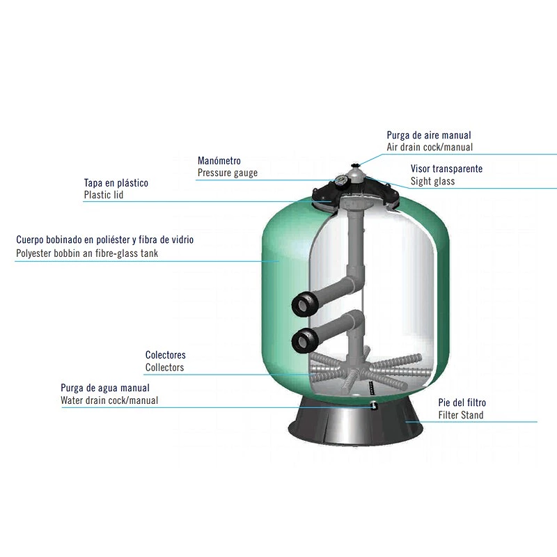 De Berlin filters zijn verkrijgbaar in diameters van 500 mm tot 1200 mm, zodat ze kunnen worden geïnstalleerd in privézwembaden met een groot volume. De zandfilters zijn gewikkeld in polyesterhars en glasvezel.