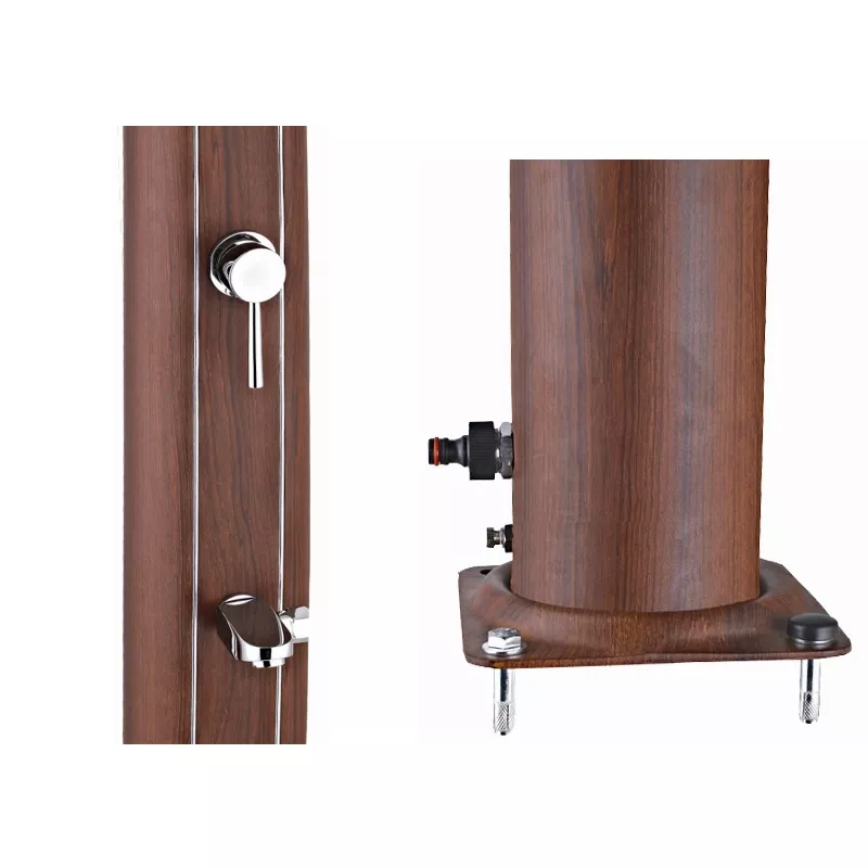 De ronde aluminium zonnedouche van 32 liter is gemaakt van aluminium, maar kan dankzij zijn houten look als decoratief element in de tuin worden geïntegreerd. Met slechts één koudwatertoevoer kan hij worden verwarmd door middel van een aluminium opslagtank van 32 liter, waarbij gebruik wordt gemaakt van zonne-energie.