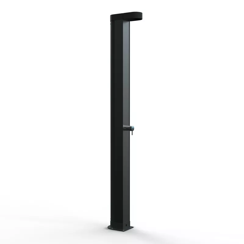 Douche in grijs aluminium. Met een koudwatertoevoer kan het water worden verwarmd door middel van een aluminium accumulatortank van 30 liter op zonne-energie. Uitgerust met een monoblock handgreep en een zenithal douchekop met antikalksysteem.