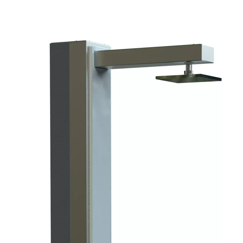 Douche op zonne-energie in mat roestvrij staal AISI-316 met frontafwerking in wit acryl. Vierkante zenithale douchekop in antikalk verchroomd messing, 2 frontjets met vernevelingseffect geregeld door een 2-weg omkeerventiel. Met een koudwatertoevoer kan het water verwarmd worden door middel van een aluminium accumulatortank van 25 liter op zonne-energie.