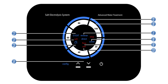 Possui indicador de alarme de sal baixo, detetor de interrutor de fluxo, controlo de produção (0-100%) e controlo RS485 (Modbus).