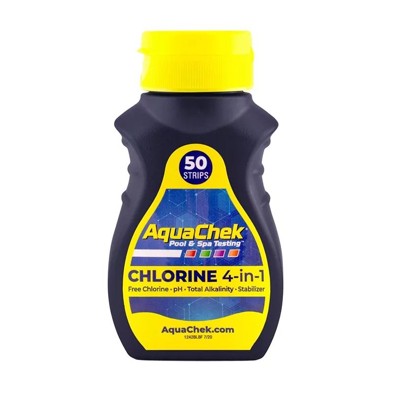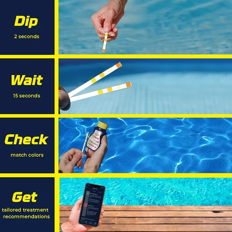 Estas tiras efectuam quatro testes importantes com um único mergulho: cloro livre, pH, alcalinidade total e ácido cianúrico. Estes testes ajudam a manter a água limpa, a prevenir a corrosão e a evitar alterações súbitas do pH.