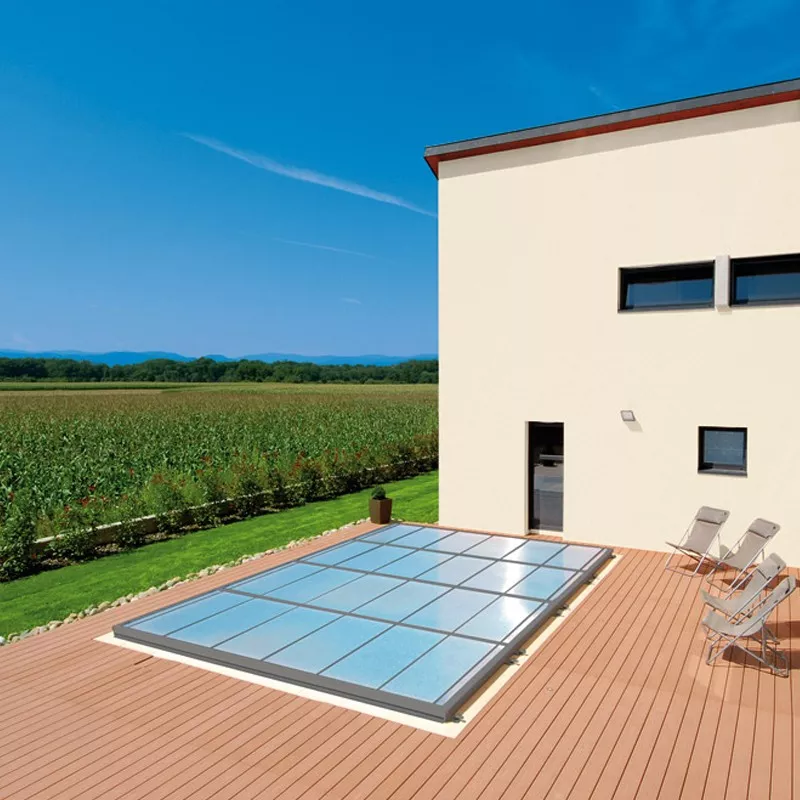 - Os módulos podem ser levantados e empilhados na extremidade da piscina para que a piscina fique completamente livre.