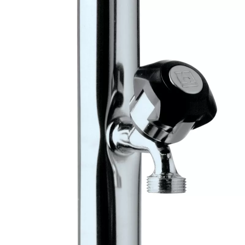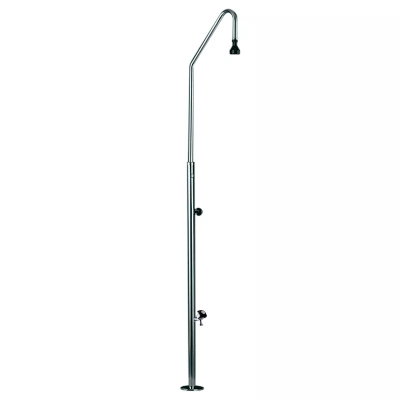Chuveiro de piscina em aço inoxidável 18/8, tubo Ø 43, com fixação 00107 integrada para uma fixação sólida ao solo.
